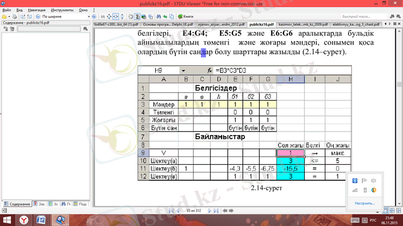 Бірінші талапты қамтамасыздандыру мақсатында B3:G3 аралыққа 1 жазамыз (1-сурет) . H9 ұяға мақсат функция формуласы: =B3*C3*D3, сонымен қатар H10, H11 жəне H12 ұяларында, сəйкесінше (а), (б) жəне (в) шектеулер формулаларының сол жағы: =B3*C3+(B3+C3) ;