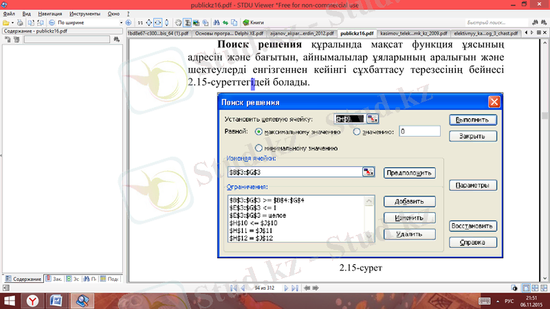 Поиск решения құралында мақсат функция ұясының адресін жəне бағытын, айнымалылар ұяларының аралығын жəне шектеулерді енгізгеннен кейінгі сұхбаттасу терезесінің бейнесі 2-суреттегідей болады.