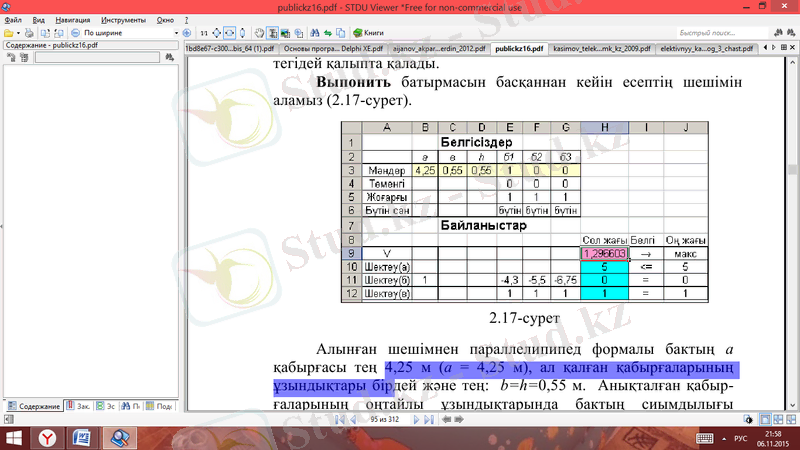 Алынған шешімнен параллелипипед формалы бактың а қабырғасы тең 4, 25 м (a = 4, 25 м), ал қалған қабырғаларының ұзындықтары бірдей жəне тең: b=h=0, 55 м. Анықталған қабырғаларының оңтайлы ұзындықтарында бактың сиымдылығы максимальды жəне тең: V= 1, 2966 м3 . Бактың а қабырғасының ұзындығы (4, 25, 5, 5 жəне 6, 75 м) берілген жəне математикалық модельде олар туралы қосымша шектеулер қарастырылғандықтан, табылған бактың сиымдылығы, есепті қосымша шектеусіз шығарған сиымдықтан азаяды. Сонымен, дискреттік программалау көмегімен алдын ала берілген мəндердің ішінен экстремальдық мəнге жетуге ықпал жасайтындай бір мəнді алуға болады, бірақ мұндай əдістен мақсат функция жақсармайды. Дискретті программалау есептерін шығару барысында тек нəтиже бойынша есеп (Отчет по результатам) алынады. Онда ешқандай да жаңа деректер болмайды, сондықтан оны талдау қажетсіз. Нұсқалық талдау қалай жүргізілетініне тоқталсақ, олда сызықты емес программалау есептерінде қолданылған тəсілдер арқылы жүргізілетінін байқаймыз. Дискреттік программалау есептерін шығарғанда параметрлік талдау біраз қызықты. Мысалға, 4-суретте қарастырылып отырған есептің ізделіп отырған пара-метрлері (бактың қабырғаларының ұзындығы) үздіксіз (есепті бульдік айнымалыларысыз шешу) жəне үздікті (яғни дискретті программалау есебі құрылып, бірнеше мəндердің ішінен бір мəнді, бульдік айнымалылары арқылы таңдау) болған жағдайда нəтижелерді салыстырыу үшін сценария кестесі келтірілген.