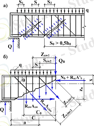 Q sw - көлбеу сызаттарымен өтетін, бір көлденең арматураның қабылдайтын көлденең ішкі күш (сурет 7, 3) ;