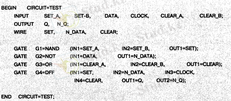 Логикалық модельдеуді орындау үшін, ең бірінші, инженерлерге сызбаның вентильдер қосылыстарының кестесі деп аталатын (gate-level netlist) мәтіндік сипатын жасау керек болды. Қазіргі дербес компьютерлердің шығуынан бұл мәтіндік сипат белгілі бір файлға жазылатын болды (сурет 5) .