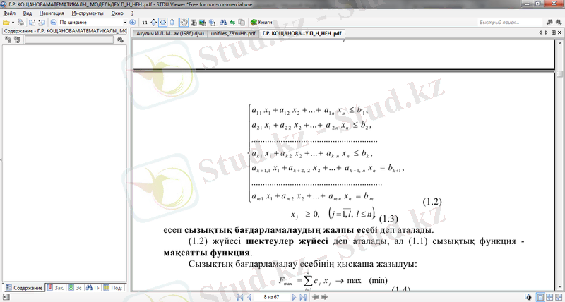 Егер X (x 1 , x 2 , . . . , x n ) жоспар үшін (1. 4) мақсатты функция максималды немесе минималды мән қабылдаса, онда ол оптималды (тиімді) жоспар деп аталады. Егер (1. 5) шектеулер жүйесі тек теңсіздіктерден тұратын болса, онда сызықтық бағдарламалау есебінің мұндай түрі стандартты (симметриялық) деп аталады; егер (1. 5) шектеулер жүйесі тек теңдіктерден тұратын болса, онда