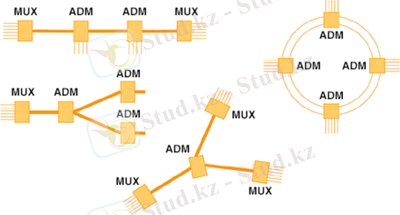 2. SDH желісінің топологиясын қарастырайық, стандартты базалық терім топологиялары бар. SDH технологиясы негізгі үш топологияны да толығымен қолданады (1. 2 сурет) . Осы топологиялардың әрқайсысының өзіне тән артықшылықтары мен кемшіліктері бар.