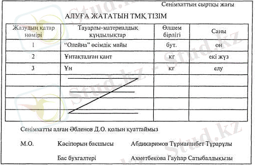 Жабдықтаушылардың (жіберушілердің) қоймаларынан ТМҚ-ды алған кезде алушы-кәсіпорын өздерінің жауапты тұлғалары арқылы жүзеге асырады.