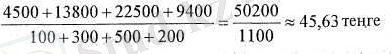 Жұмсалған бензиннің құны 45, 63 теңге х (50+150+300+100+100+100) =36504 теңге. Қалдық құны 300x45, 63 теңге немесе 4500+45700-36504=13696 теңге.