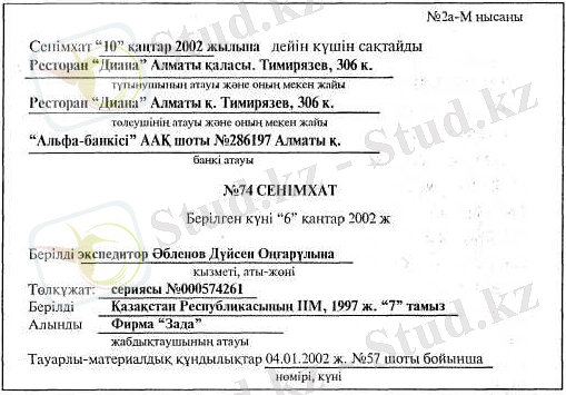 Жабдықтаушылардың қоймасынан тауарларды алу үшін материалды жауапты тұлғаға сенімхаты беріледі. Сенімхатты бухгалтерия рәсімдеп, алушының қолын қойғызып, қолхат алу арқылы береді. № М-2а типтік ведомосы аралық нысаны, алдын ала немірленген және түптелген Журналға (ү. №М-3) тіркеледі. № М-2а нысаны төменде келтірілген.