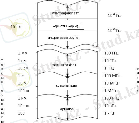 Сымсыз (радио) арналар. Сымсыз байланыс жүйелерінде (радиобайланыс) электромагниттік энергия жіберіліс ортаға жарықтандыру орнын атқаратын антенна арқылы жіберіледі. Антеннаның физикалық өлшемі және құрылымы, ең алдымен, жұмыс жиілігіне байланысты. Электромагнитті энергияның жоғары сәулесін алу үшін, антенна өлшемі 1/10 толқын ұзындығынан үлкен болуы керек. Осыдан, радиостанция жіберілісі АМ мен берілетін, f c = 1 МГц деп есептесек, λ = с /f с . = 300 м толқын ұзындығы үшін кем дегенде диаметрі 30м болатын антеннаны қажет етеді. 2. 2 суретінде радиобайланыс үшін әртүрлі жиілік диапазондары көрсетілген. Электромагниттік толқындардың атмосферада және бос кеңістікте таралуын үш түрге бөлуге болады, беттік толқынның таралуы, кеңістік толқынмен таралуы, тура толқынмен таралуы. Төмен жиіліктегі және дыбыстық диапазонда, толқын ұзындығы 10 км ден артық болғанда, жер және ионосфера электромагниттік толқын таралу үшін волновод құрайды. Осы жиіліктік диапазонда байланыс сигналдары бүкіл жер шарымен таралады деуге болады. Сондықтан осы жиілік диапазондары, ең алдымен, бүкіл дүние жүзінде кемелердің жағамен навигациялық байланысында қолданылады. Осы диапазонда қол жеткілікті жиілік каналдарының жолағының кеңдігі аз (негізінен 1 . . . 10 % орталық жиілік), сондықтан, осы арнамен жіберілетін ақпарат төмен салыстырмалы жылдамдыққа ие және ол негізінен цифрлық жіберіліске тән емес.