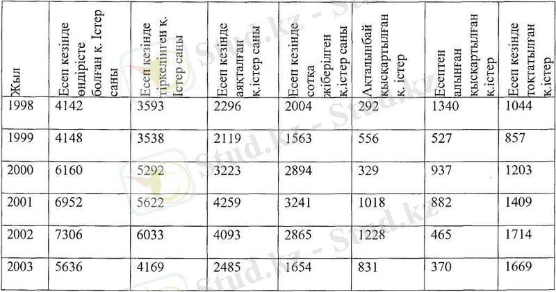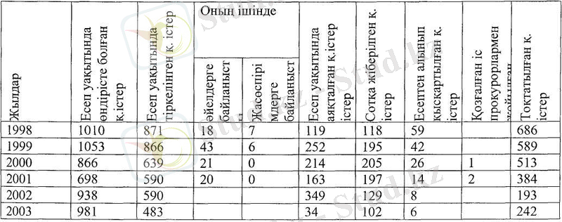 Кесте 2 - Қылмыстық қудалау органдарының есебі бойынша жалған ақша мен бағалы қағазды жасау, сақтау, не сату жөніндегі қылмыстардың 1997-2003-жылдар аралығындағы күйлері туралы мәліметтер
