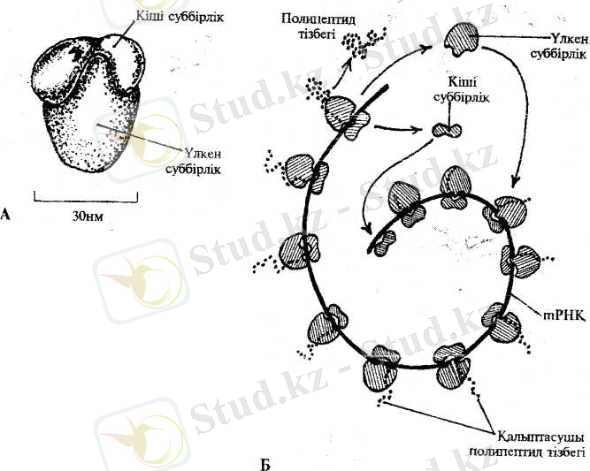 Әрбір рибосома үлкен және кіші суббірлікіперден тұрады (2-сурет; А) Белок синтезделуі кезінде кіші суббірлік ; гРНҚ-ны және акгивтелген (белсенді) тРНК-ны байлайды. Үлкен суббірлік кұрамындағы пептидилтранс фераза ферменті аминқышшлдар арасында пептидті байланыстар қалыптасуын және өсуші полипептидтік тізбекке аминқышқылдардың қосылуын катализдейді.
