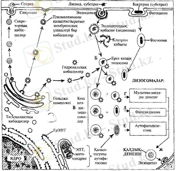 4-сурет. Жасушанын корыту аппараты - эндосомалар мен лизосомаларлың жүйесі. А. Плазмалеммадан бөлініп шыққан эндосома клатрин қабығынан айырылып, гилролазалық көбікшелермен біріккеннен соң, ерте кездік эндосома ( Б) деп аталады. Мұнда лизистік ферменттер әсерінен субстраттың ыдырауы баяу өтеді, себебі, олардын белсенділігі төмен. В . Кеш кездік эндосомалардың ішкі ортасынын қышқылдығы экогары, сойдықтан, ферменттері белсенді. Г-Е. Кеш кездік эндосомалар ерте кездік эндосомалармен, фагосомамен және аутофагосомамен бірігіп, үш түрлі лизосомалар қалыптастырады. Ыдырау өнімдері жасуша кажеттілігіне колданылады. Ж . Қорытылмай калған заттар калдық денеше құрамында экзоцитоз арқылы жасуша сыртына шығарылады.