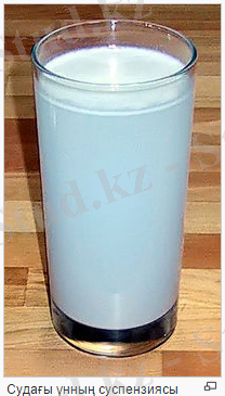 Суспензия - қатты дисперстік фазаның сұйық дисперстік орта-да таралған микрогетерогенді система. Ондағы қатты бөлшектердің өлшемі 0, 1 мкм<г<10 мкм. Егер бөлшектердің дисперстік дәре-жесі төмен болса, онда оның радиусы үлкейіп, тұрақтылығы төмен-дейді де тез тұнбаға шөгеді. Суспензиялардың дисперстілігін мик-роскоп, электронды микроскоп сияқты оптикалық немесе седимен-тациялық анализ көмегімен анықтауға болады.
