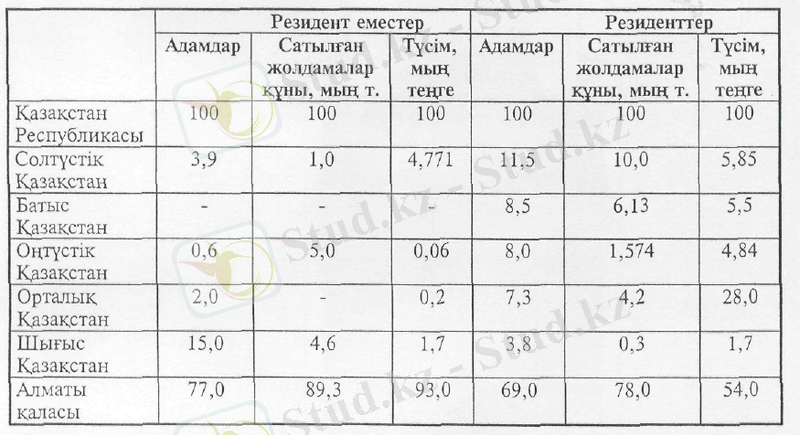 Қазақстанның 5 экономикалық ауданындағы туристерге қызмет көрсету мөлшерін қарастыра отырып (1-кесте), мынандай қорытынды жасауға болады: резидент еместер (ҚР азаматтары емес) мен резиденттердің (ҚР азаматтары) көп бөлігіне Алматы қаласында туристік қызмет көрсету деңгейі тиісінше 77 һәм 69 процент екен. Түсімнің де қомақты бөлігі Алматы қаласы үлесіне тиген, яғни резидент еместерден 93%, ал резиденттерден 54%. Тек аз ғана сыбағасы (28%) Орталық Қазақстан экономикалық ауданының резиденттеріне (7, 3%) келсе, Солтүстік Қазақстан экономикалық ауданының бір Ақмола облысының өзі 5, 9% резиденттерді қамтыды. Бұл ауданның барша резиденттер санының жартысы болып тұр. Шетел туристерінің Алматыдан кейінгі ат басын көбірек тіреген жері Шығыс Қазақстан өңірі (15%) . Осыдан ұғынарымыз, шетелдіктердің басымы оңтүстік астанамызда шоғырланса, өз азаматтарымыздың дені "шоп-туризмді" солтүстік астанаға қарай өрістетіп, дамытып жатыр.