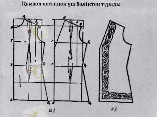 Тігу технологиясы : Матаны беттестіре екі бүктеп, тақта бетіне жайып, сызбадағыдай саламыз. Ол үшін матаның ұзын бойына А нүктесінен Б нүктесіне түзу сызық жүргіземіз. Енді матаның нүктесіне қарай А нүктесімен В нүктесін белгілейміз. Кеуде өлшемін алғаннан кейін АВ сызығына параллель Г нүктесінен Г1 нүктесіне сызық жүргіземіз, ол 12 см-ге тең. Бел өлшемін анықтау үшін Т нүктесінен Т1 нүктесіне сызық жүргіземіз, ол тең 18 см-ге. ТТ1 нүктелеріне параллель ББ1 нүктелерін белгілейміз. Бұл мықын өлшемі 27 см-ге тең. Артқы мойын ойындысын А және А1 деп белгілеп, 7 см-ге оямыз. Иық үстіндегі тігіс сызығы АА1 нүктелері 13 см. Артқы бойдың арқасы 34 см, алдыңғы бойдың алды 32 см болады. Жалпы киім ұзындығын белгілеп сызамыз, пішеміз, көктейміз. Үстіге кейіп өлшейміз. Мойын, жең түптерін бормен сызып, белгілейміз. Бүкпелерінде аса дәлдікпен белгілеп түзулейміз. Бүкпелер арақашықтығын дәлдікпен белгілеп, тексеріп аламыз. Жанындағы қоспа көктеу тігісті сөгіп, алдыңғы екі өңірін беттестіріп алып, алдыңғы өңір әдібін пішеміз. Алдыңғы өңірдің әдібіне дәлме-дәл етіп астарды пішеміз. Бүкпелердің керекті орнын қатырамыз, сосын артқы бойға артқы астарын салып жеке пішеміз. Алдыңғы екі бойға қатырманы жапсырамыз. Алдыңғы екі бойдың өңір әдібін әдіптейміз. Тігеміз, үтіктейміз. Жас мөлшеріне байланысты қалаған арнайы дайын өрнекті қамзолдың екі өңіріне сызамыз. Өрнекті қолмен де, машина көмегімен де кестелеуге болады. Айшықты болу үшін ою шетіне түзу сызықтар жүргіземіз. Астардағы бүкпелерді тігіп, үтіктейміз. Астарды әдіп шетіне көктеп алып, түзулеп тігеміз. Астар тігілген әдіп шетін көктейміз. Әдіп көтеріліп тұрмау үшін тиісті бекітетін орындарды бекітеміз. Иық тігістерін қоспай тұрып, алдыңғы екі өңірге артқы бойды қосып тігеміз, үтіктейміз. Киімді жайып, артқы бойды артқы бойға көктеп, машинаға тігіп, үтіктейміз. Киімді жайып сыртқы етек әдібін түзулеп, 3-4 см-ге әдібін қайырамыз. Әдіп шетін көктейміз. Әдіп ұшына астар ұшын келтіріп, дәлдікпен көктейміз. Қамзолды иық жағынан аударып, етегін айналдыра машинамен тігеміз. Киімді жайып, қолтық ойындысының түбін сиректеп, көктейміз. Сыртын сыртына, астарын астарына келтіріп, иық тігістерін жүргізіп, үтіктейміз. Желке ойынды түбін әдіппен бірдейлестіріп көмкереміз. Қолтық ойындысын матаны 3 см етіп, қиғаштап қиып аламыз да, қолтық түбін айналдыра көмкереміз. Көктеу жібін алып, үтіктейміз.