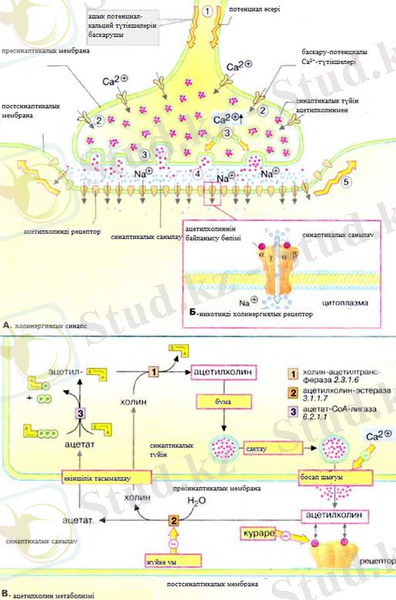 Сурет 4. 4. Жүйке импульсінің берілуі мен ацетилхолиннің холинергиялық синапстағы метаболизм сызбасы.