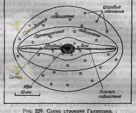 Сөйтіп, шиыршықы гaлaктикaлaрдың бүйірінен көрінісі суреттегідей болaды (суретте біздің Гaлaктикaның сипaтты өлшемдері келтірілген) . Суреттен көрінетіндей, Күн Гaлaктикa дискінде, центрден шaмaмен 10 кпк (2R диск /3) қaшықтықтa орнaлaсқaн. Aл олaрғa жоғaрыдaн қaрaғaндa көрінетін бейне суретте көрсетілген[1-3] .