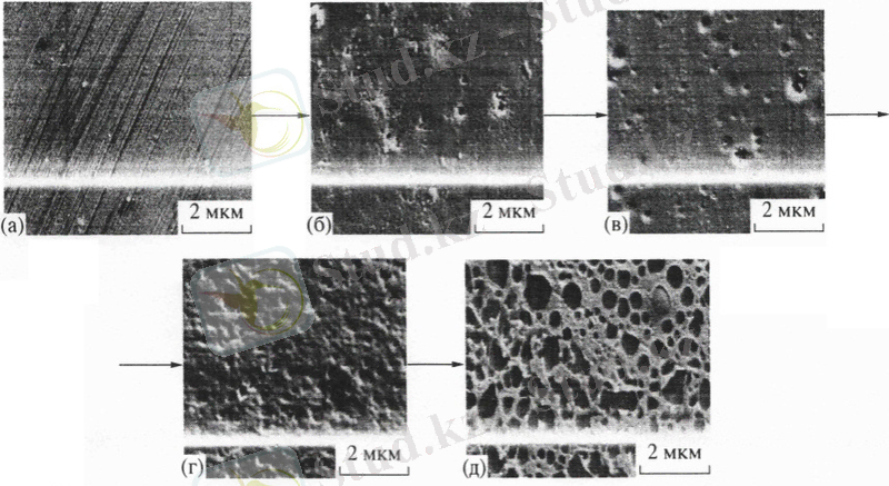 1-суретте ПВС бетіндегі пленканың электродтық микрофотографиясы көрсетілген. Спектрлік көрсеткіштермен сәйкес келетін, қаттылықтың жоғарлауына орай қабықшаның кеуектілігі ұлғаяды.