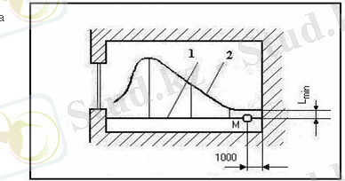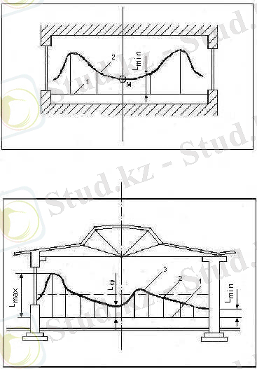а - екі жақты қабырғалы жарықтандыру; ә - аралас жарықтандыру; 1 - жұмыс жазықтығының деңгейі; 2 - бөлме қимасының жазықтығындағы ТЖК-нің өзгеруін сипаттайтын қисық сызық; 3 - ТЖК-нің орта мәнінің деңгейі; М - ТЖК-нің ең кіші мәнінің нормаланған нүктесі.