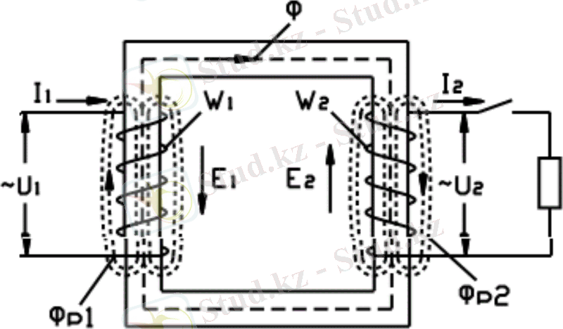 Орамсымның біреуі айнымалы кернеу көзі жалғанады (~U 1 ) . Ал екіншілік орамсымға Z n кедергі жалғанады. Біріншілік орамсымға айнымалы кернеу бергенде, оның бойында айнымалы ток пайда болады. Ол айнымалы ток магниттік өткізгіште айнымалы магнит ағынын туғызады. Ол ағын екінші орамсымда Э. Қ. К - ін туғызады.