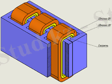 Электромагниттік индукция заңына негізделген. Бірфазды, 2 орамды трансформатордың жұмыс істеу принципін қарастырайық. Бұл трансформатор стерженьнен және екі обмоткадан (орам сымнан) тұрады.