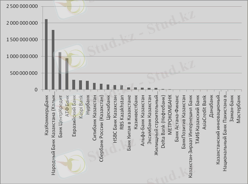 Көріп отырғандай, ең көп үлесті Казкомерцбанк алады екен. Екінші орында Халық банкі, ал үшінші орында Банк Центр кредит тұр. Бұл жердегі депозиттер көлемінен банктің сенімділігі мен тұрақтылығын көруге болады. Себебі депозиттерді тарту кезінде клиенттер ең алдымен банктің сенімділігі мен пайыздық мөлшерлемесіне көңіл аударады. Салымшы депозитіндегі қаражатын жоғалтып алмайтындай сенімді болуы шарт.