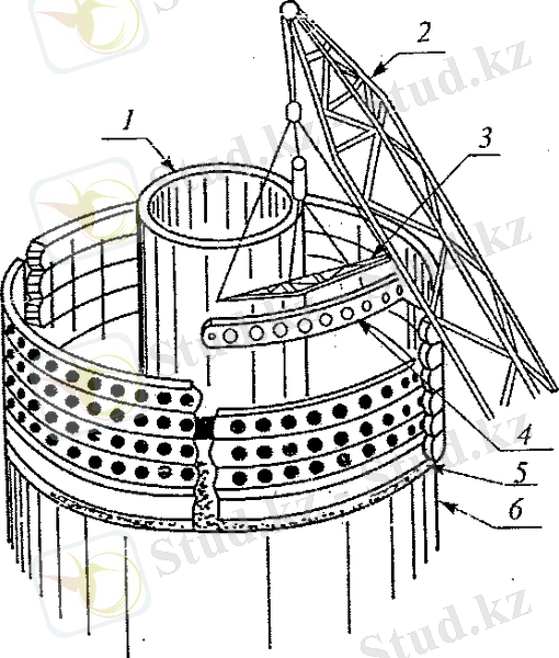 1-орталық шахта; 2-кран; 3-траверса; 4-перфорацияланған элемент; 5-біріктіру тігісі; 6-қабырға 2