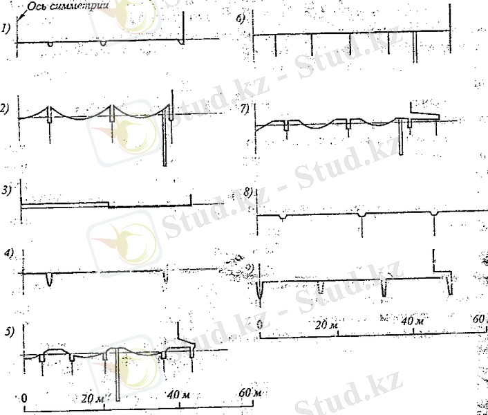 4. 9-сурет. Гравитациялық темірбетонды платформалардың тірек базасының табанының конструктивтік схемасы : 1-Дорис платформасы және Экофикс мұнайсақтауышы; 2- Берил А, Брент В және Брент Д платформалары; 3- Дорис, Фригг СДР1 және Фригг 5М платформалары; 4- Си Тэнк және Фригг ТР1 платформалары; 5- Кондип және Стадфиорд А платформалары; 6-Андок және Данлин А платформалары; 7-Кондип және Фригг ТСР2 платформалары; 8- Дорис және Пиниан платформалары; 9- Си Тэнк, Брент С және Корморант А платформалары