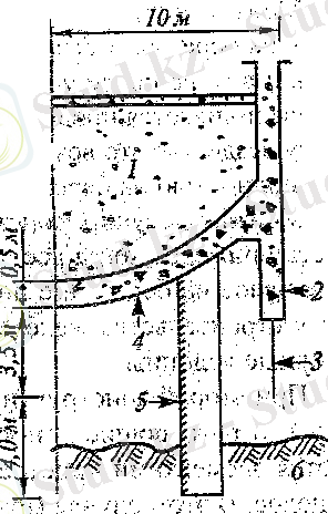 4. 10- сурет. КОНДИП платформасының тірек базасының іргетас топырағымен түйісу детальдары: 1- құмды балласт; 2- темірбетонды қабырға; 3- металл пышақтар (қабырға) ; 4- тірек ұяшықтың күмбезі; 5- цилиндрлік элементтер; 6- түп топырағы