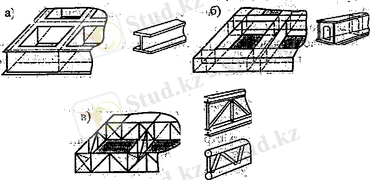 4. 11- сурет. Жоғарғы құрылыстың конструкциясының негізгі схемалары: а -пісірілген жазық блоктардан; б - қораптық блоктардан; в - фермдерден