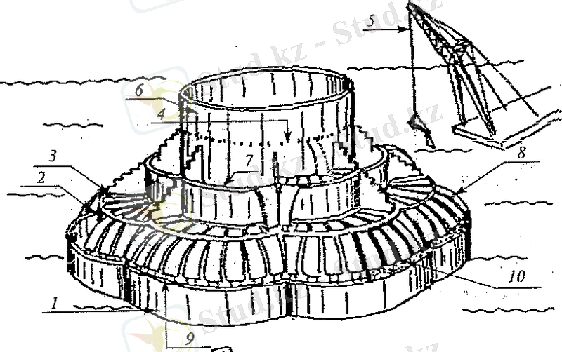 Сурет 4. 5. Наниан платформасы, жалпы түрі: 1-құбыр; 2- орталық шахта; 3- бұрғылау мұнарасы; 4- газды жағуға арналған консоль; 5- жоғары құрылымның тасымалдау рамасы; 6- толқынды басатын саңылаулы жақ; 7- кондукторлар; 8- жүзгіштік камерасы; 9- сыртқы диафрагммалар; 10-тірек базасының саіылаулы жағы.