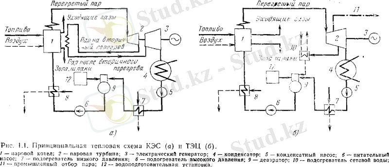 Егер КЭС-пен ЖЭС-ті сұлбалары бойынша салыстыратын болсақ, онда айтарлықтай айырмашылықтар байқалмайды. Ең басты айырмашылық, ол ЖЭЦ-тің паровой трактіндеү. Ол өзінің міндеттеріне тұтынушыға жеткен энергияны ыстық су мен бу ретінде жеткізуді кіргізеді. Төмендегі суретте КЭС-пен ЖЭЦ-тің жалпы сұлбалалары көрсетілген.