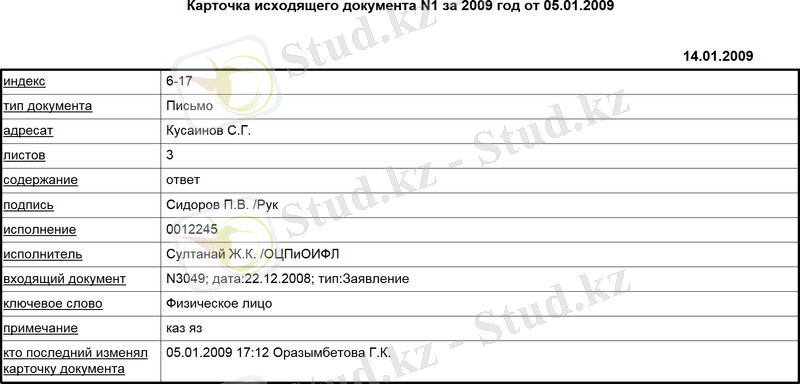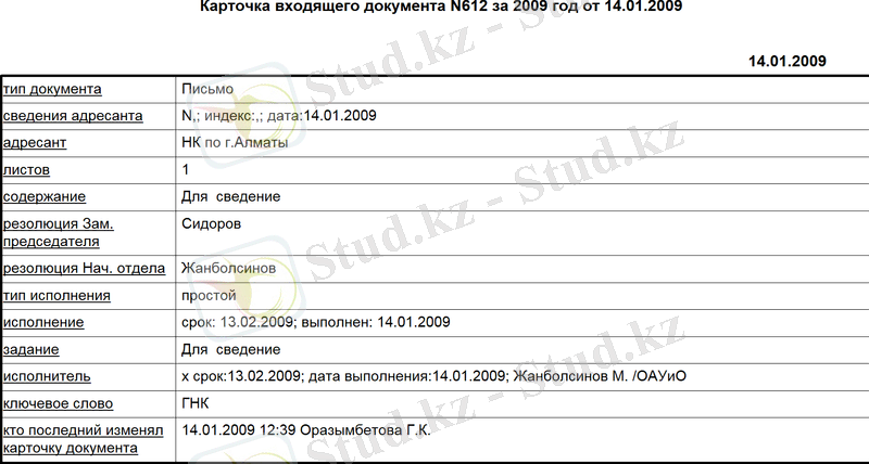 Әр отделға келіп түскен хаттарды канцелярия қабылдап және әр отделға бөліп береді. Ол отдел ол хатты ҚР-ң салық кодексі бойынша белгіленген мерзімде орындауы тиіс. Канцелярия келіп түскен хаттарды қадағалап отырса, ал Құқықтық статистика прокуратурасы канцелярины тексереді тексереді.