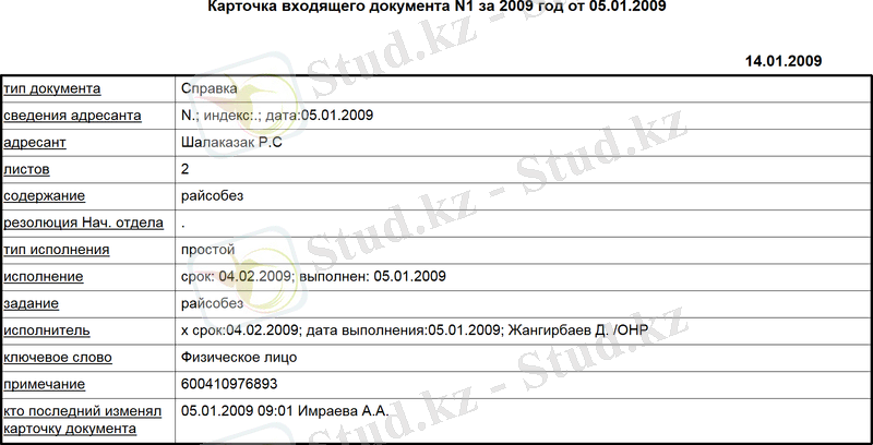 Т. Рысқұлов Салық Басқармасы айналымының документі