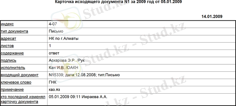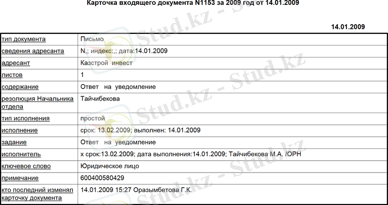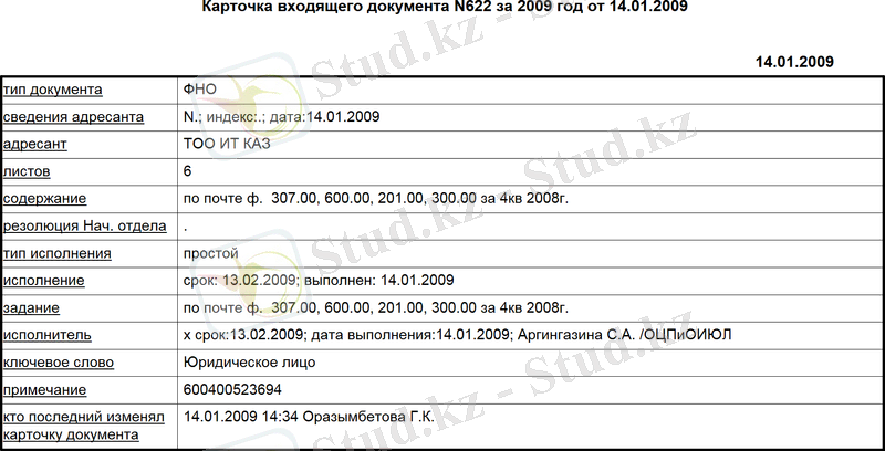 Әр бөлімге келіп түскен хаттарды канцелярия қабылдап және әр бөлімге бөліп береді. Ол бөлім ол хатты ҚР-ң салық кодексі бойынша белгіленген мерзімде орындауы тиіс. Канцелярия келіп түскен хаттарды қадағалап отырса, ал Құқықтық статистика прокуратурасы канцелярины тексереді.