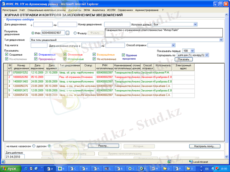 Мен онда салық төлеушілерді тіркеп СТН бердім, жеке кәсіпкер емес деген анықтама бердім, контрольді кассалық машинаны тіркедім, қосылған құн салығы бойынша тіркеп тіркеуден шығаруды үйрендім. Барлық жұмыстар ИНИС бағдарламасы арқылы жасалады. Жеке кәсіпкерлерді тіркеу және тіркеуден шығару, жеке кәсіпкерлігінің куәлігін беру, патент беру, ОКЭД нөмірін өзгерту(вид деятельности) . Барлық кәсіпоррындағы өзгерістер мен тіркеулер төмендегі бланкалар(004. 00 008 02 001 00 ) тіркеубөліміне тапсырылады . ККМ қатысты хабарлама тарату.