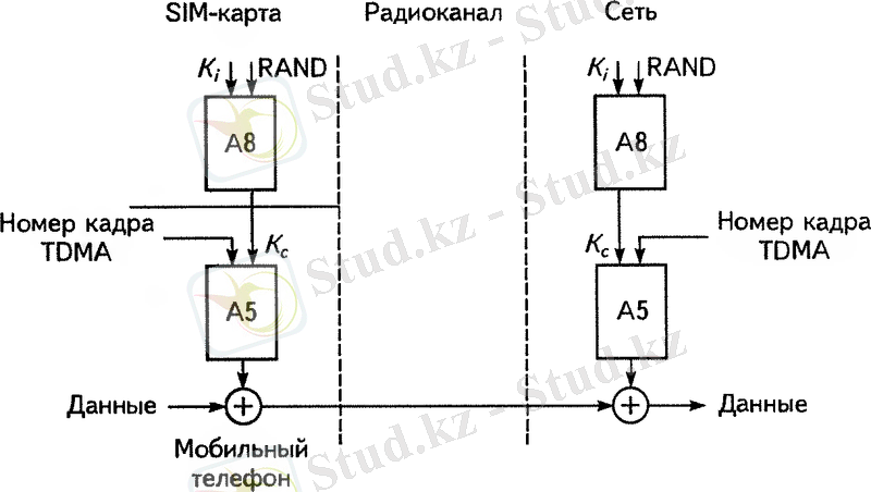 А5 шифрлеу алгоритмі мобильді телефонда қолданылады. Бұл алгоритмді желі іске қосады. Идентификация нәтижесінде SIM-карта деректерді шифрлеу алгоритмі үшін жеке К і және RAND саны негізіндегі кілт алады. Бұл кілт SIM-картада сақталатын А8 алгоритмі бойынша анықталады.