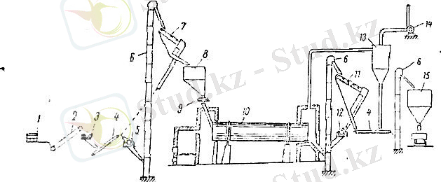 1-вагетонетка; 2- пластикалық қоректендіргіш; 3-жақты ұстағаш; 4-ленталы тасмалдағыш; 5-балғалы ұсақтағыш; 6-элеватор; 7-елек; 8-гипс тасының шанағы; 9-дөңгелек табақты қоректендіргіш; 10-кептіру барабаны; 11-сілкілдететін елек; 12-балғалы диірмен; 13-батарейлі циклон; 14-желдеткіш; 15-дайын заттың шанағы;