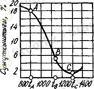 1-сурет. Күйдіру температурасына байланысты керамикалық бұйымдардың сужұтқыштығының өзгеруі: А, Б, С - бұйымдардың су жұтқыштық интервалы