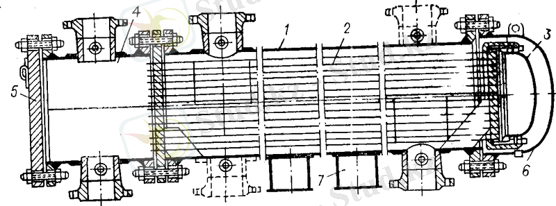 1 - корпус; 2 - құбырлар жиынтығы; 3 - қозғалатын басы; 4 - таратушы камера; 5 - қақпағы; 6 - түбі; 7 - тірек;