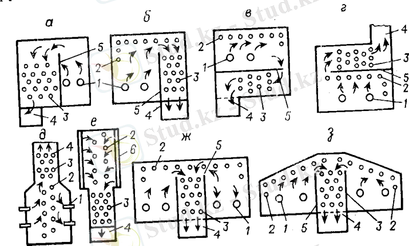 Сурет 5. Құбырлы пештердің негізгі типтері: а- конвекционды пеш, б - конвекционды камерасы бүйірінде орналасқан бір камерлы пеш; в - конвекционды камерасы төменде орналасқан бір камерлы пеш; г - конвекционды камерасы жоғарыда орналасқан біркамералы пеш; д - Вертикальды цилиндрлік пеш, е - Тұтас жандырғышы (форсунка) бар жалынсыз жанатын біркамералы пеш, ж - төбесі горизантальды екікамералы екіағынды пеш; з - төбесі көлбеу екіағынды екікамералы пеш; 1 - жандырғыштар(форсунка) ; 2 - радиантты змеевик, конвекционды змеевик; 4 - түтін шығатын түтік;