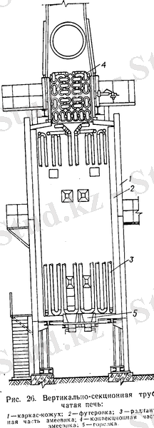 Сурет 7. Вертикальды-секционды құбырлы пеш: 1- каркас-кожух; 2- футеровка, 3-радиантты бөлігі, 4 - конвекционды бөлігі; 5 - жандырғыш;