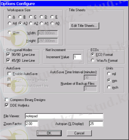 Электрикалық маңызды сұлбаны құру алдында P-CAD 2006 Schematic графикалық редакторының пішінінінің реттелуін жүргізу керек. Ол үшін P-CAD 2006 Schematic менюынан Options/Configure әмірін орындаймыз және ашылған терезеде (4. 2-сурет) Workspace Size бөлімінде жұмыс аймағы үшін қажетті бет форматын көрсетеміз(біздің жағдайда-А4), Units бөлімінде mm метрлік жүйе бірлігін таңдаймыз(ЕСКД бойынша маңызды сұлбаны жасауда метрлік жүйе бірлігін қабылдау ұсынылады) және де Orthogonal Mode бөлімінде 90/90 Line (егер осы пәрмен қосылып тұрса, онда ортогональді сызықтар мен өткізгіштер енгізіледі) мен 45/90 Line (егер бұл пәрмен қосылып тұрса, онда диагональ бойынша сызық енгізу мүмкін) ортогональді тәртіптерді таңдаймыз.