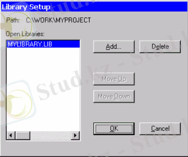 Schematic библиотеканың қосылысымен аяқталады, символдар компоненттері Library/Setup командасының көмегімен пайда болады(58 сурет) . ашық библиотека жобасы көрсетіледі. Жаңа библиотеканың қосылуы Add ілгегінің көмегімен орындалады, библиотеканы жою - Delete көмегімен. Move Up және Move Down ілгектері библиотека тізімін араластыра алады.