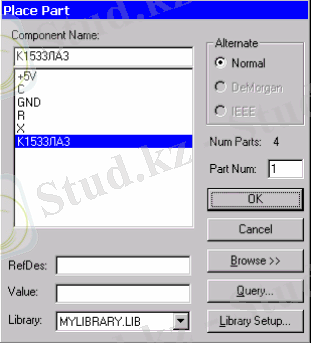 RefDes және Value полесінде позиционды белгі және номиналды енгізу компонентісін орындауға болады. Library Setupілгегінің көмегімен кіріп параметрлер библиотека құрылымынLibrary/Setup командасы орындалады. Бірінші логикалық элемент микросұлбасын енгіземіз К1533ЛА3. Ол үшін Place Part терезесінде элемент тізбегінен К1533ЛА3 таңдап алып Part Num полесінде логикалық элементтің нөмірін енгіземіз(1. 5 сурет) .