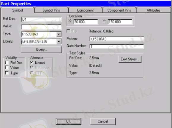 Позициялық түсініктің элементтері автоматты турде сызбада әріптік және сандық түрде секциялық логикалық тізбекте қолданамыз. Компонеттік номермен секцияны бөлу үшін қос нүкте қолданамыз(мысалы, DD1:1 немесе DD1:А), ГОСТу-дың талабына сәйкес келмейді. Стандартты сақтау үшін позициялық түсінікті қолмен немесе атрибутпен мәтінге енгізуді ұсынамыз. Компонетті К1533ЛАЗ сызбада Edit/Part Properties пәрменді қолданамыз да ашылған терезені Part Properties көрінетін атрибуттардағы жалауларды лақтырамыз Ref Des, Value және Type бөлімінде Visibility (сур. 1. 7) . Қалған барлық компонеттерді аналогикалықты қолдануға ұсынамыз. (сур. 1. 8)