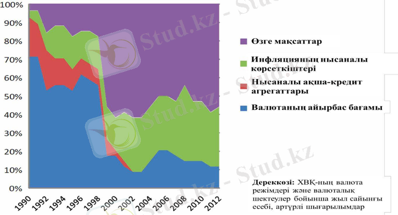 1998 жылғы дағдарыстан соң инфляциялық таргеттеу режімін қолданатын елдердің үлесі ұлғайған кезде валюталық таргеттеуді қолданатын елдердің үлесі күрт төмендеді. 2000 жылдардың басынан бастап орталық банктердің ақша агрегаттарын таргеттеуі іс жүзінде қолданылған жоқ (7-график), алайда басқарылатын айырбастау бағамының «аралас» режімін және көп мақсаттылықты қолданатын елдер санының өскендігі байқалады.