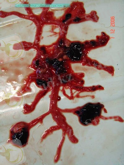 Патологиялық анатомиясы. Зақымдалған жағында ми қабықтары ісіңкіреп ми қатпарлары тегістеу болып көрінеді. Қан кұйылған жерде ми тіні былжыр болып, қанмен аралас ботқа тәрізді болып келеді, түрі -қоңы-сары болады. Гематома көбінесе қыртыс асты ядроларында орналасады. Науқас тірі қалған жағдайда қан құйылған жердегі элементтер сіңіп, сорылып, орнында қуыс пайда болады. Куыста серозды сұйықтық болуы мүмкін, немесе глиозды тыртық калады. Микроскопиялық тексеріс кезінде ісік, реактивті қабыну, нерв элементтерінде дегенеративті өзгерістер анықталады. Қан тамырларында артериосклероз, "псевдоаневризмалар", аневризмалар көрінуі мүмкін.