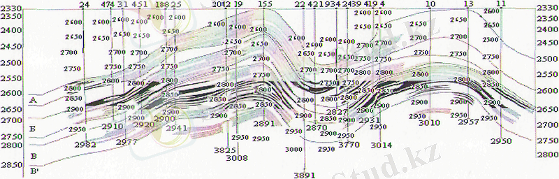 Қабат қимасында каротаж қисығы мәнінің сипаты бойынша жыныстардың тығыздығы және саздылығы жоғары мәнге ие болатын реперлер сериясы бөлінген. Бұл материалдар 2550-2900м тереңдікте жататын «А», «Б», «В», «В'» шартты түрдегі 4 өнімділік қабатқа бөлуге мүмкіндік берді.