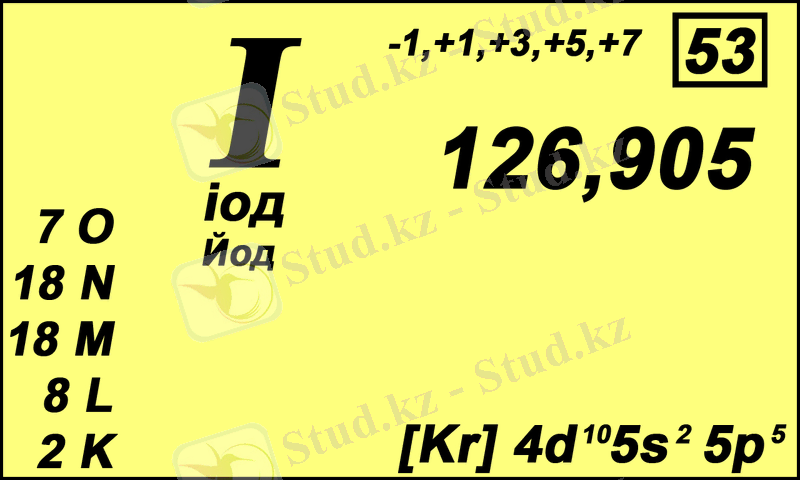 Йод - элементтердің периодтық жүйесінің VІІ тобындағы химиялық элемент. Галогендер тобына жатады, ат. м. 126, 9; ат. н. 53; тығыздығы 4, 93 г/см3; балқу t 113, 60С; қайнау t 184, 350С. Галоген. Табиғатта бар галогендердің ішінде аз кездесетін радиоактивті астатты есептемегенде, йод ең ауыры болып табылады. Табиғатта кездесетін йодтың көбісі массалық саны I 127 болатын жалғыз изотопынан тұрады, оның жер қыртысындағы құрамы массасы бойынша 4 * 10 -5 % құрайды. Радиоактивті Йод I 125 табиғи радиоактивті түзілістер кезінде пайда болады. Йодтың жасанды изотоптарының ішінде маңыздылары - Йод I 131 мен Йод I 133 . Оларды негізінен медицинада қолданады.
