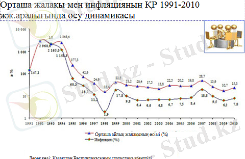 Сурет 1. Орташа жалақы мен инфляцияның ҚР 1991-2010 жж. Аралығында өсу динамикасы (Дерек көзі: ҚР статистика агенттігі)