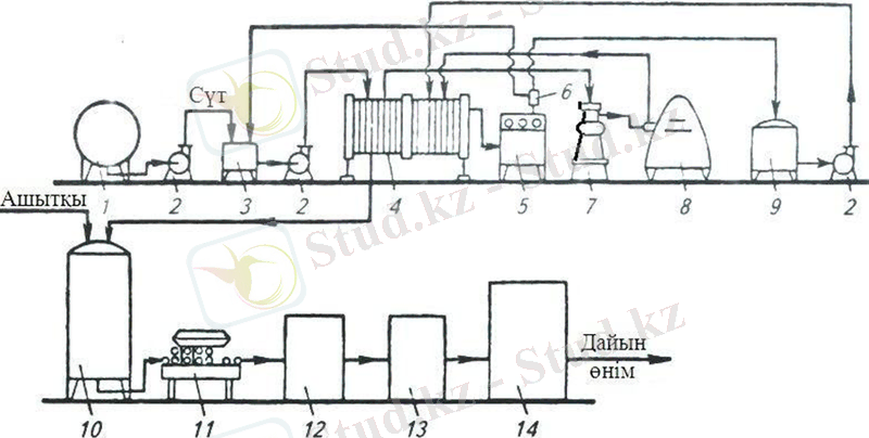 Сурет-1. Сүтқышқылды сусындардың резервуарлы әдіспен өңдеу өндірісінің технологиялық желісінің сұлбасы: